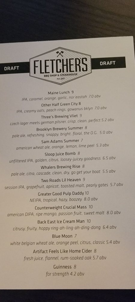 Fletcher's, located in Longmeadow, MA, offers a diverse menu featuring steakhouses, barbeque, and wine bar options. With delivery and takeout services available, Fletcher's provides a casual dining experience with a full bar and attentive waiter service. Customers rave about the cozy atmosphere, delicious drinks like the Raspberry Spritz and Grand Daddy, and kid-friendly options like chicken tenders and waffle fries. The bbq seasoning adds a flavorful twist to the already tasty dishes. Local patrons praise Fletcher's as a top choice for quality BBQ, with standout items like cornbread and pulled pork winning over even the most discerning palates. Don't miss out on the sandwiches, loaded fries, and nachos, although some note that the sides could use improvement. Overall, Fletcher's is a must-visit spot for a satisfying dining experience that goes beyond just BBQ.